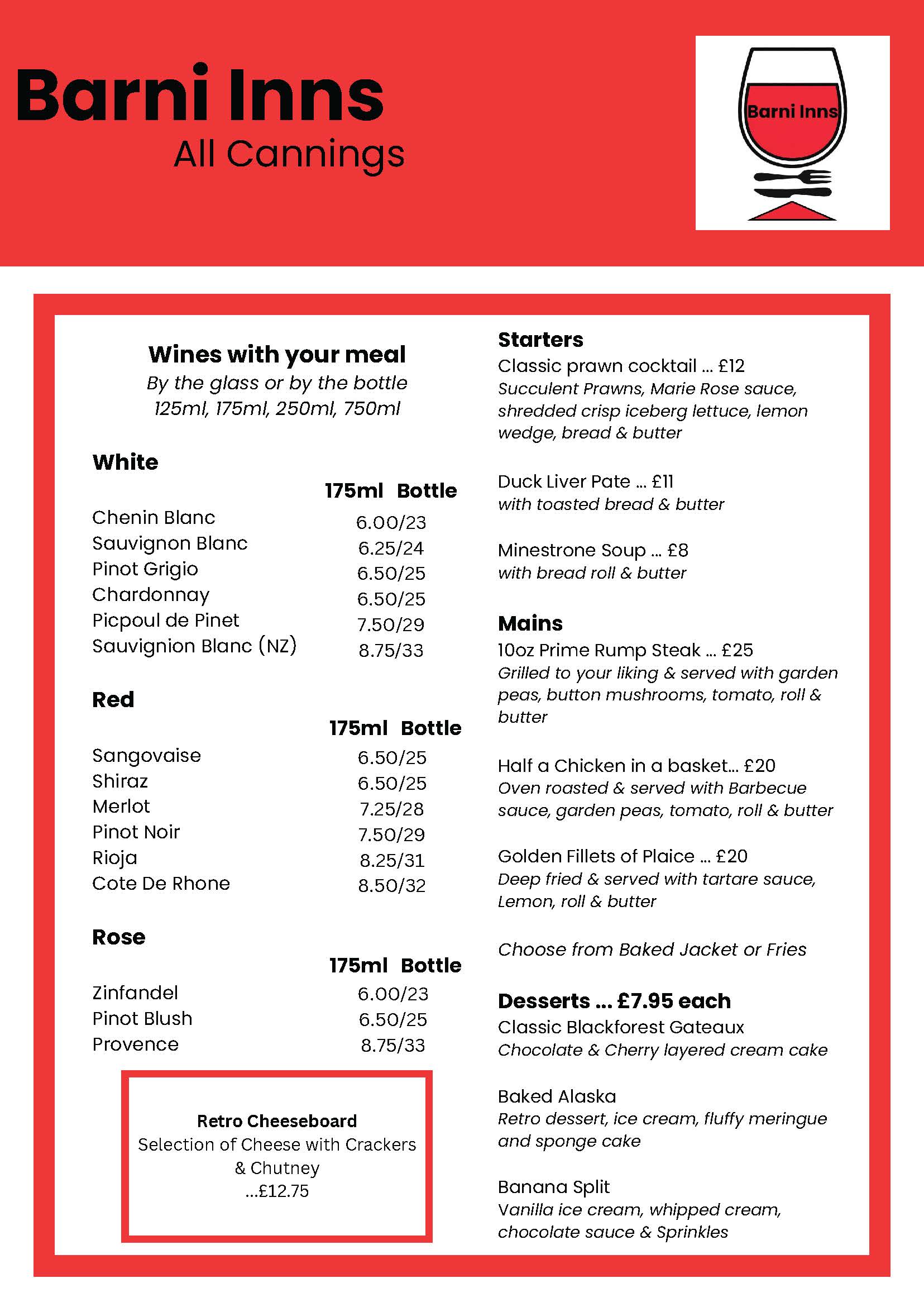 Come for dinner and choose from our Barni Inns retro menu!